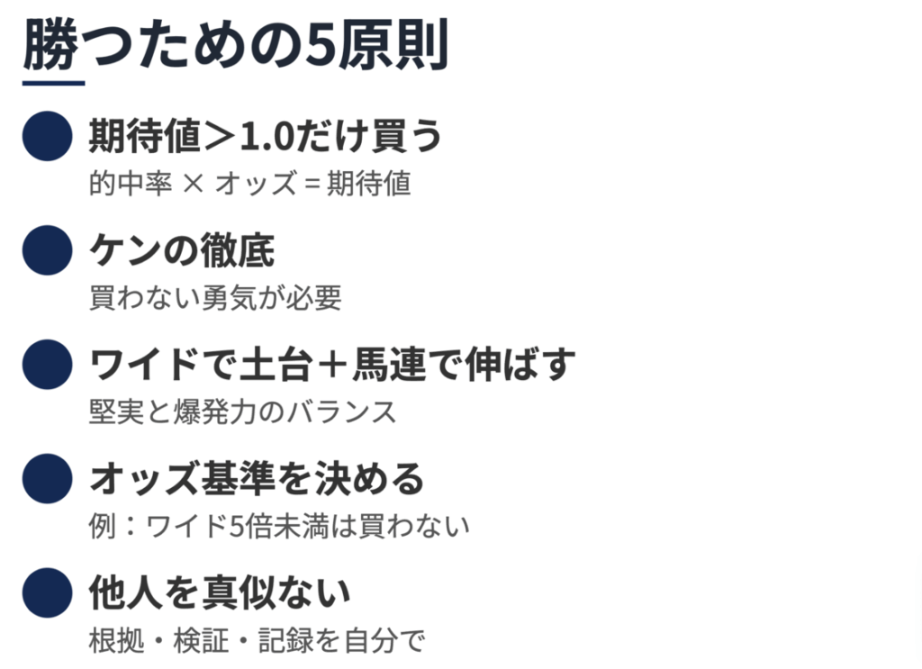 期待値=的中率×オッズを意識し、価値あるオッズ(過小評価されている馬)を狙いましょう。