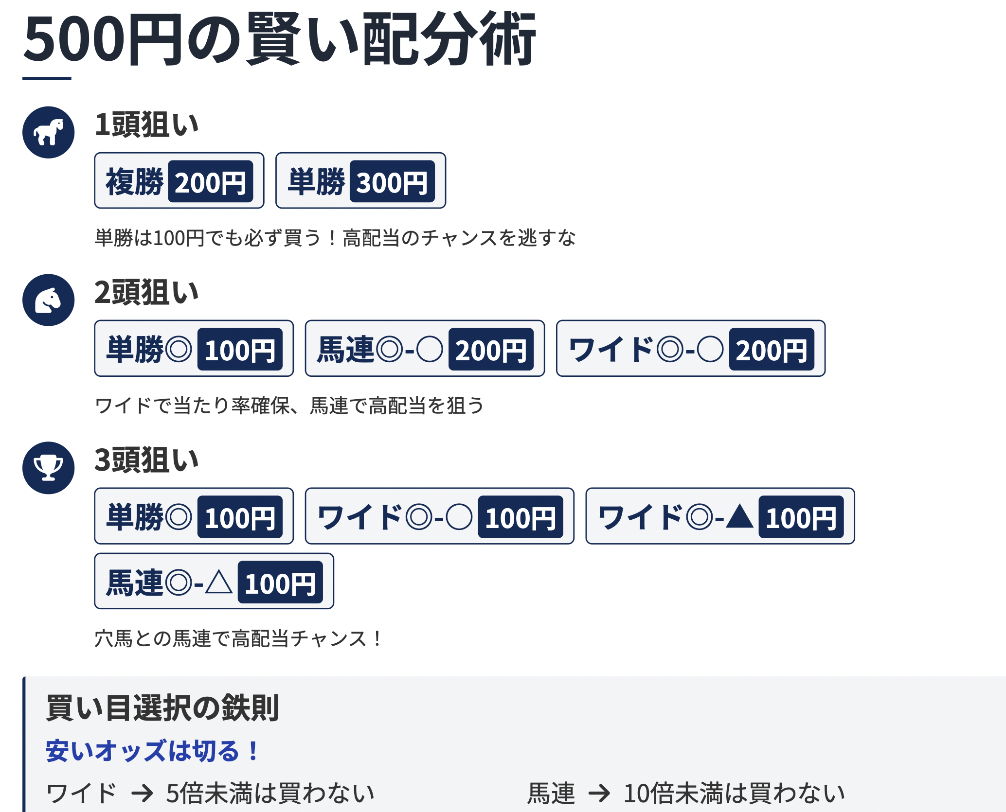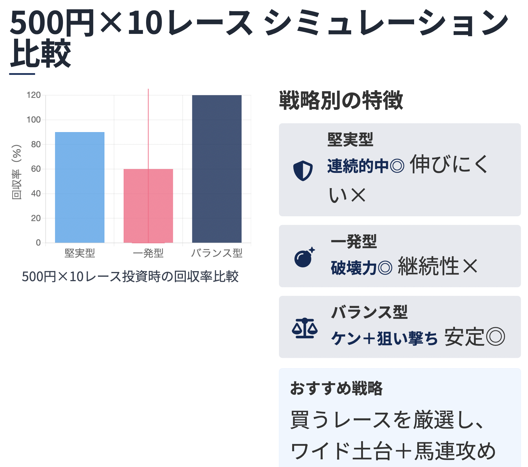 以上から、500円で勝負する場合は「当てやすさ」と「払い戻し期待値」のバランスが取れた券種を選ぶのがポイントです。