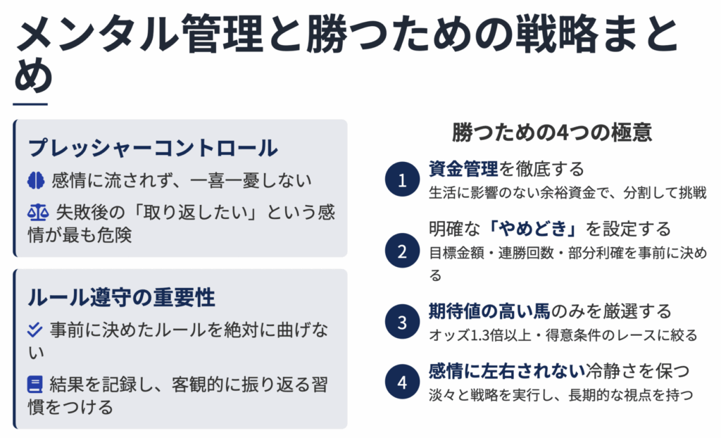 一度失敗したら、一旦冷静になる時間を取り、必要であればその日の競馬をそこで切り上げる勇気も必要です。感情の波に飲まれず、常に平常心を保つ訓練が、長期的な成功には不可欠です。