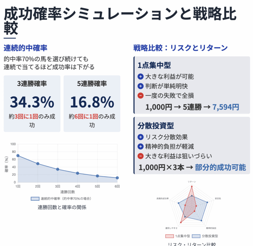 オッズの妙味を見極め、期待値の高い馬券だけを厳選する冷静な分析力。第三に、確率論に基づいた現実的な目標設定。無謀な長連勝を追わず、数学的な不利を理解した上で戦略を立てること。第四に、自分に合ったスタイルの選択。