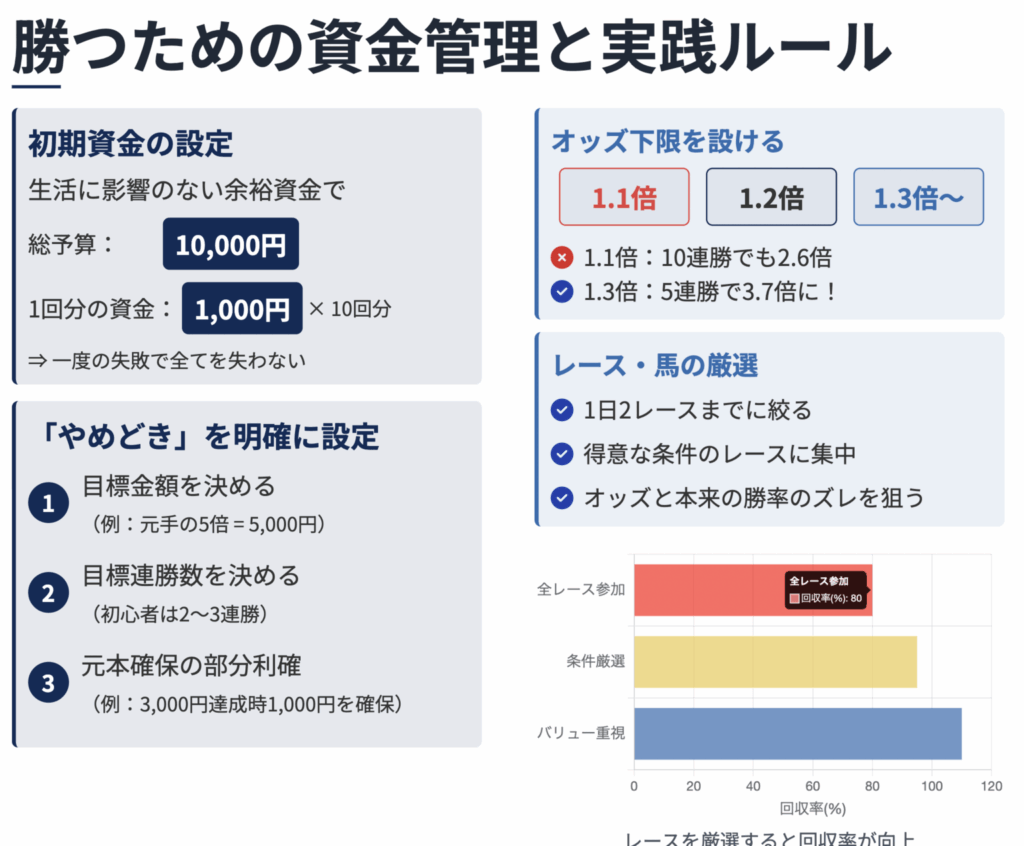 複勝転がしをギャンブルではなく戦略として実践する上で、最も重要なのが資金管理とリスクコントロールです。