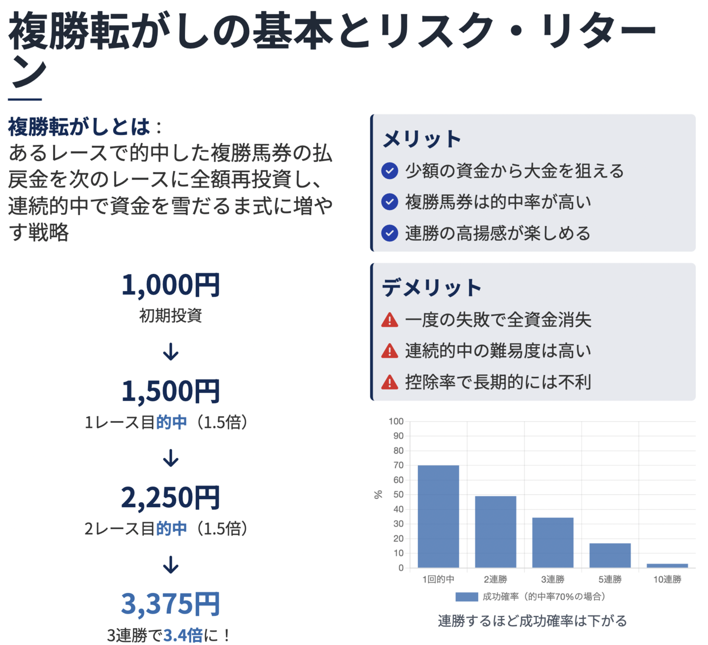 | 基本ルール | 的中した複勝の払戻金を、次のレースへ全額再投資し、複利効果で資金を増やす戦略。 |