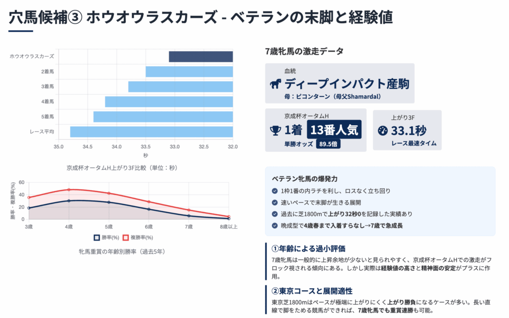 - ホウオウラスカーズ:年齢で人気落ちなら妙味。東京の直線で末脚が炸裂すれば再度波乱を演出。