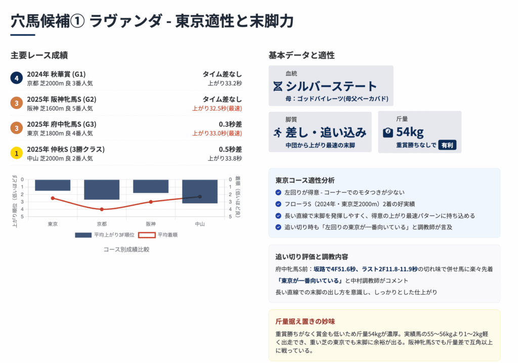 - コースに噛み合う瞬発力と自在性 阪神牝馬Sでは、勝ち馬とタイム差なしの3着に入り、メンバー中最速の上がり32秒台を記録。秋華賞や府中牝馬Sでも後方から鋭い末脚を繰り出しましたが、あと一歩届かないレースが続いていました。中団からでも捲りやすく、長い直線で末脚を発揮しやすい東京芝1800mは、この馬の瞬発力が最大限に生きる絶好の舞台と言えるでしょう。