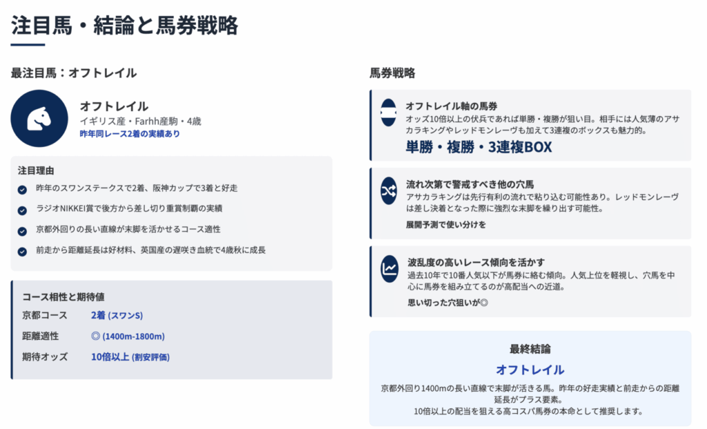 3頭の穴馬候補の中で筆者が最も注目するのはオフトレイルです。昨年の同レースで2着に健闘し、その後も阪神カップ3着と1400m重賞で好走を続けました。今年に入り敗れていますが、それにより人気が大きく落ちることは間違いありません。京都外回り1400mは末脚勝負になりやすく、ラジオNIKKEI賞で見せた豪脚が再び炸裂する可能性があります。英国産の遅咲き血統で4歳秋の成長が見込める点や、前走からの距離延長が好材料である点も心強いです。オッズ10倍以上の伏兵であれば積極的に狙ってみたい一頭と言えるでしょう。