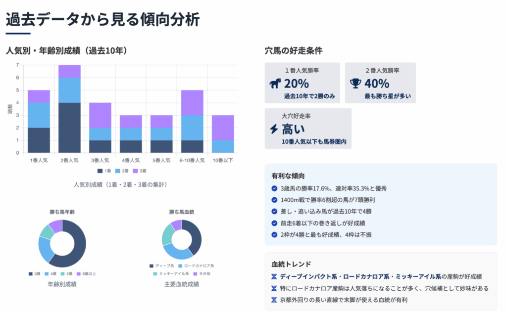 過去10年の年齢別成績では3歳馬が勝率17.6%・連対率35.3%と優秀で、1400m戦で勝率6割超の馬が7頭も勝っています。若さと距離適性を兼ね備えた馬が穴を空ける傾向が強いです。