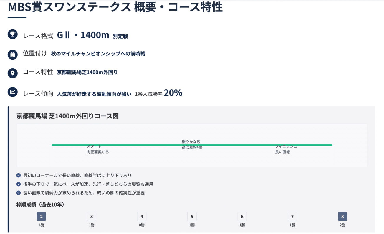 コースは京都競馬場芝1400m外回り。スタートは向正面奥からで、最初のコーナーまで長い直線があり、直線半ばには高低差約4mの緩やかな坂を上り下りします。後半の下りで一気にペースが加速するため先行・差しどちらの脚質も通用する一方、ラストの長い直線で瞬発力が求められることが多いです。枠順では2枠が4勝と最も好成績で、逆に4枠は不振。血統面ではディープインパクト系・ロードカナロア系・ミッキーアイル系の産駒が勝ち星を挙げており、1400mでの勝率が高い馬や3歳馬が活躍しています。