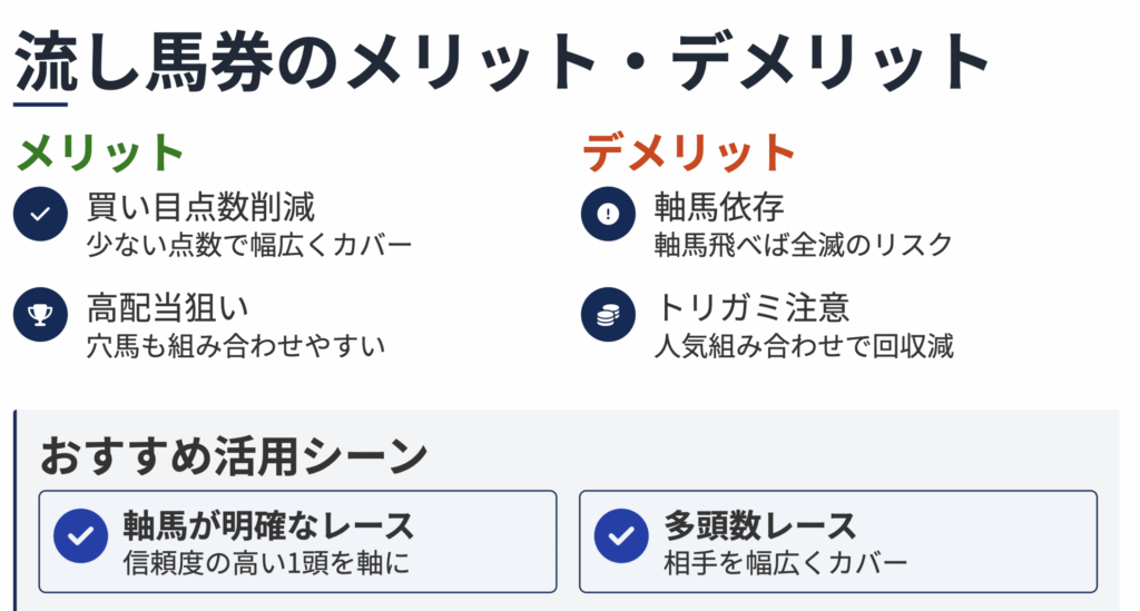 軸馬を決めて買い目を広げる流し馬券には、多くのメリットがある一方で、使い方を誤ると思わぬ落とし穴もあります。