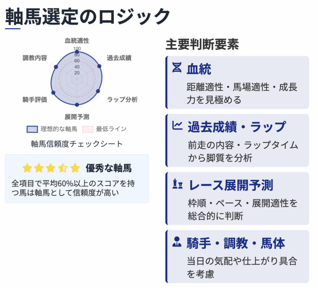 流し馬券で最も重要になるのが「軸馬を何にするか」です。現代の競馬予想では、様々なファクターを組み合わせて軸馬の信頼度を見極めるのが主流です。