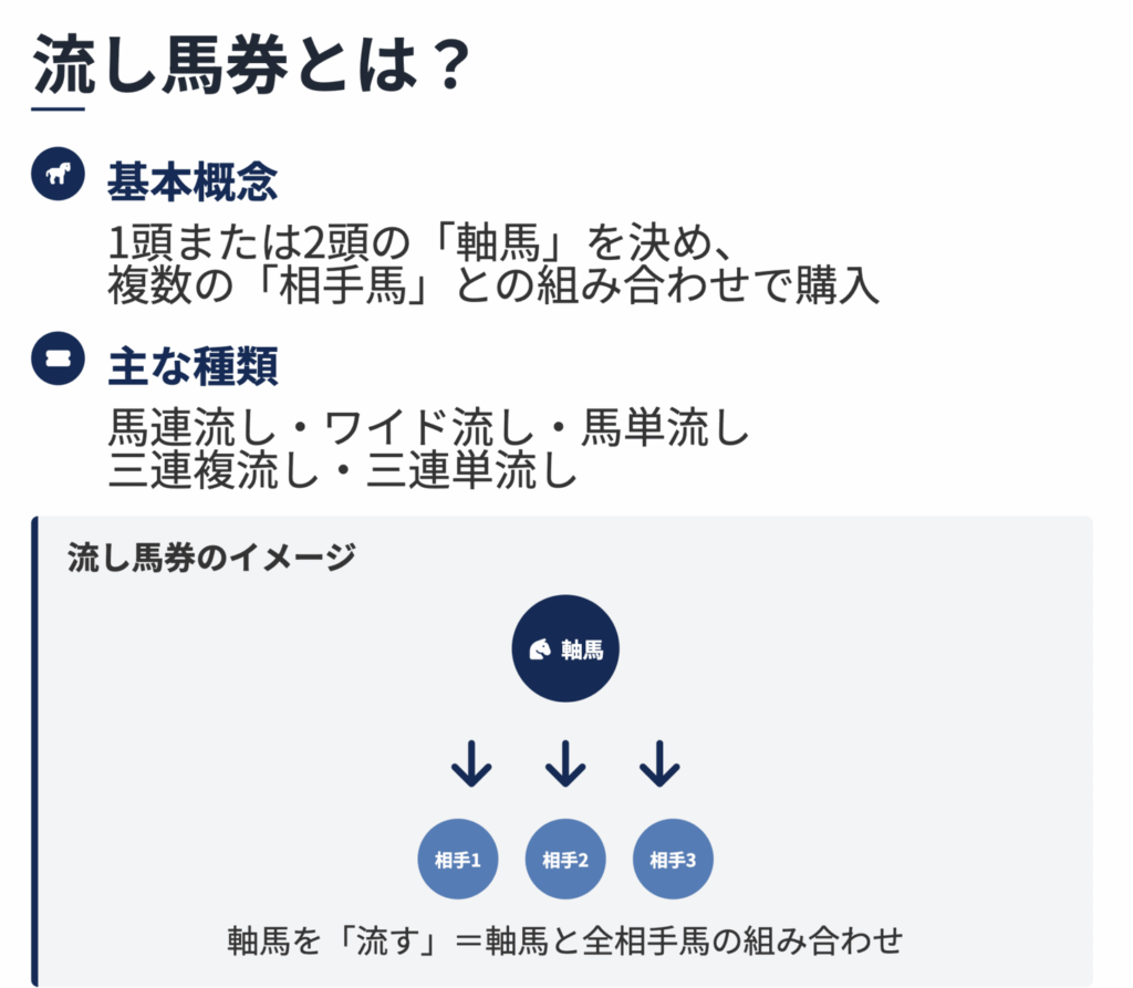 競馬の「流し」馬券とは、1頭(場合によっては2頭)の「軸馬」を決め、その軸馬と複数の「相手馬」との組み合わせで馬券を購入する方法です。例えば馬連で1番を軸に選び、相手馬に2番・4番・6番を選択すると、「1-2」「1-4」「1-6」といった計3点の組み合... -