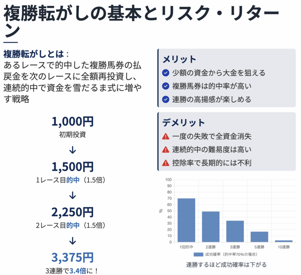 競馬ファンの間で密かに人気の「複勝転がし」という賭け方をご存知でしょうか?少額の資金から始めて連続的中で資金を雪だるま式に増やせる夢のある戦略として、「競馬で勝つ」ためのテクニックとして紹介されることもあります。 図解でわかる!複勝転がし... -