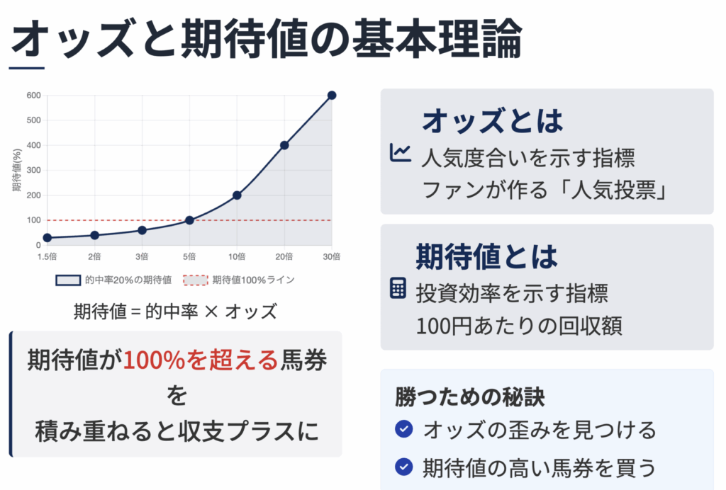 計算式は「的中率 × オッズ」で表され、この数値が100円(100%)を超える馬券を買い続けることができれば、理論上、長期的には収支がプラスになります。