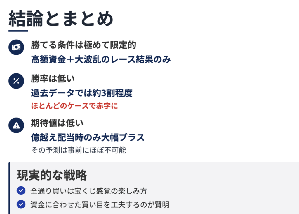 このシミュレーションでは、幸運にも3回は億超え配当などでプラスになったものの、トータルでは約1,000万円のマイナスになりました。全通り買いは理論上必ず的中する反面、収支面ではギャンブル性が極めて高く、現実的には期待値が低い戦略と言えます。