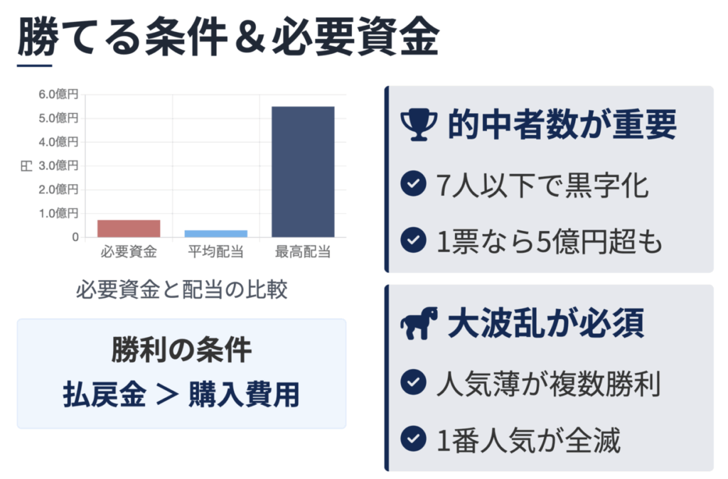 本命決着や数百万円〜1,000万円台の中途半端な高配当では、全通り購入はほぼ確実に大きな損失を生みます。WIN5の平均配当(数千万円規模)ですら、平均的な購入費用(約7,300万円)を大きく下回ります。勝つためには、よほどの大波乱による「億超え配当」を引き当てる以外に道はない、というのが現実です。