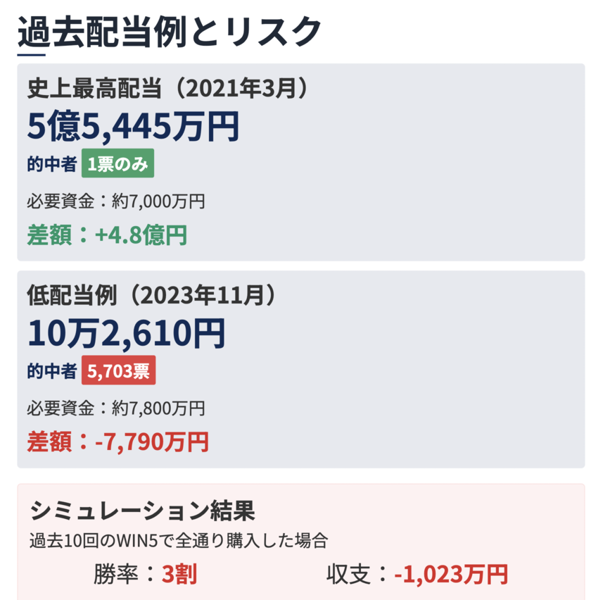 前述のように、実際のWIN5では全通り購入に平均して約7,300万円以上の資金が必要です。したがって払い戻しがこの7,348万円を超えなければ、全通り買いはトリガミ(取り返し損)になり赤字です。